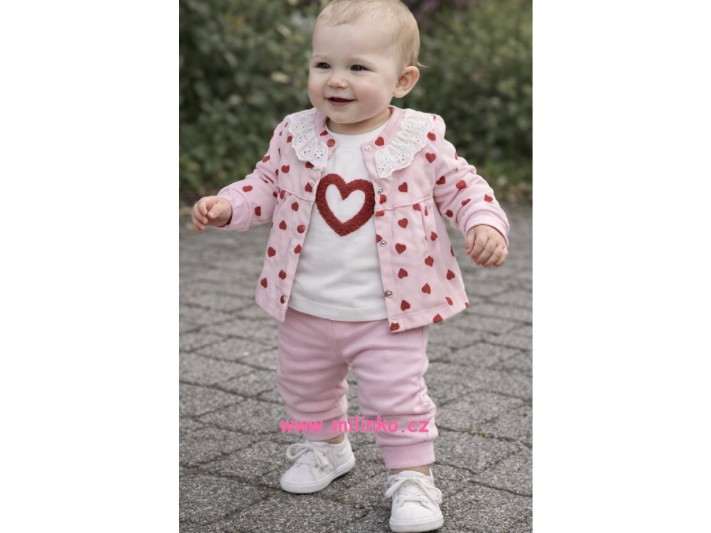 Třídílná kojenecká souprava oblečení. Souprava se skládá z mikiny, kalhot a dlouhého trička s dlouhým rukávem. Tato roztomilá třídílná dívčí souprava je ideální volbou pro batolata, kde se pohodlí snoubí s půvabným vzhledem. Vysoce kvalitní, k pokožce šetrná bavlna zajišťuje pohodlí po celý den.