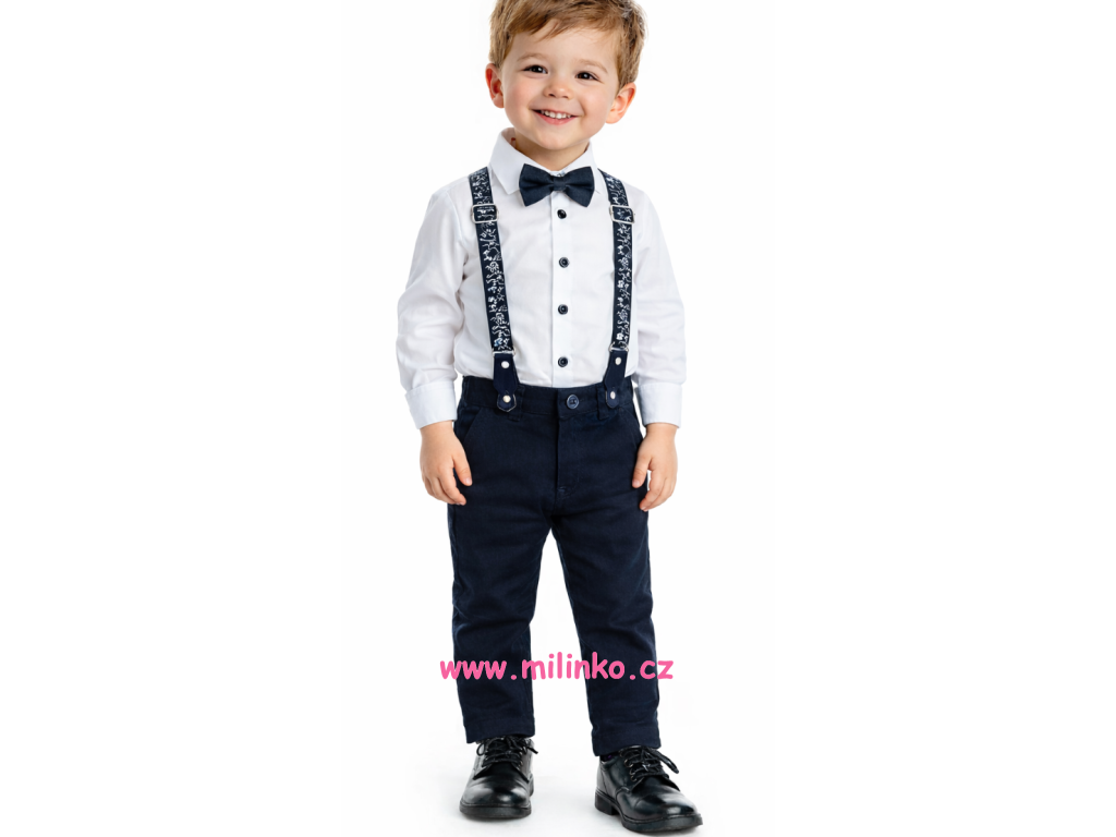 4 dílný kojenecký set pro kluky. Tento lehoučký kojenecký set sestává z košilového body na dlouhý rukáv se zapínáním na knoflíky, z kalhot pro miminka se šlemi a z motýlka. Celý set je dokonale barevně sladěný a je vhodný pro slavnostní příležitosti.